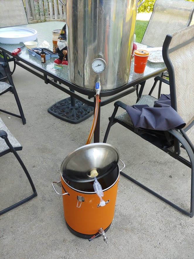 And, I drained the wort into fermentor on top of about half the yeast I had collected from Great Frontier.